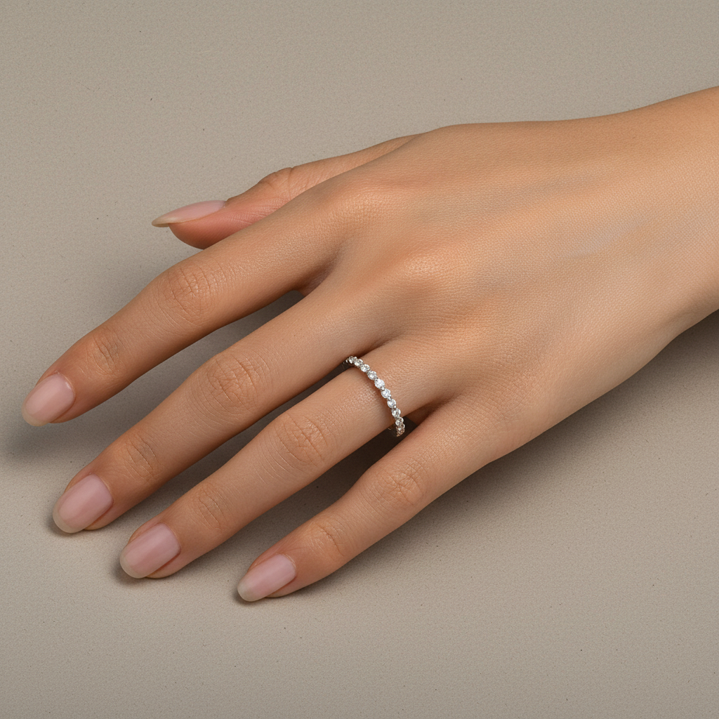 The band is a testament to timeless beauty and refined craftsmanship. Its delicate design makes it a perfect match for any engagement ring, adding a touch of brilliance without overpowering the main stone. This ring is not just a piece of jewelry; it is a celebration of love, a promise of forever, and a reflection of the wearer’s unique style and grace.