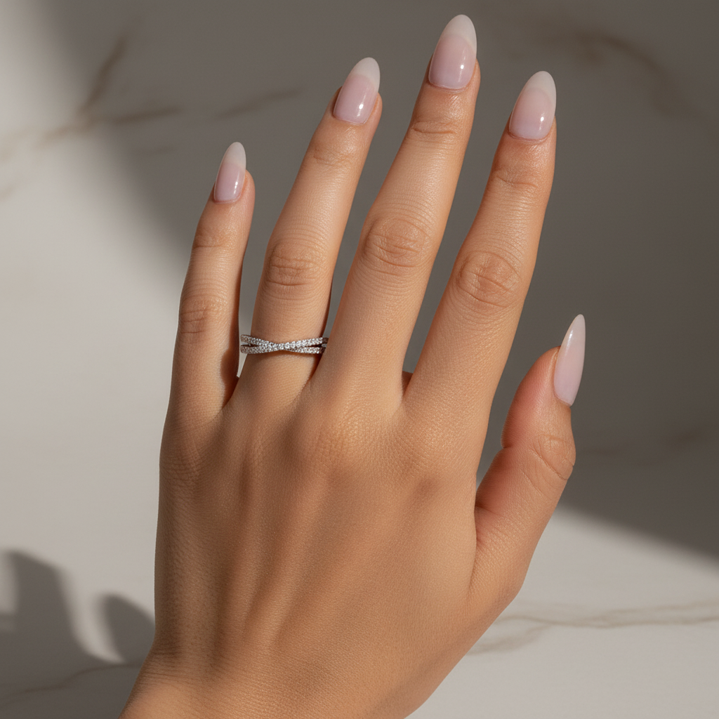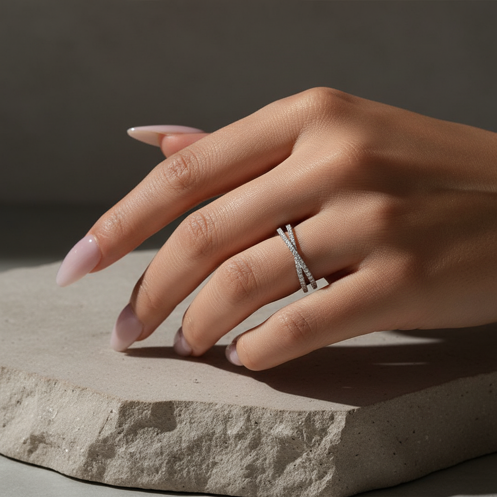 Design Inspiration: The criss cross design of the band is a symbol of intertwined destinies and the enduring bond between two individuals. The intersecting lines of sterling silver, adorned with the 18K white gold plating, create a dynamic visual effect that is both modern and timeless. This design not only adds a unique flair to the band but also enhances its structural integrity, making it a piece that is as robust as it is beautiful.