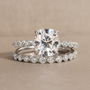 Set in 925 sterling silver with platinum plating, the luminous metal reflects the strength and purity of commitment, ensuring the ring shines through every chapter of life. The delicate yet bold claw setting enhances the moissanite’s fire, making it a true statement of devotion. Accompanied by a wedding band adorned with shimmering stones, this set represents two souls intertwining in a journey of love and growth.