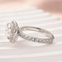 Design Inspiration: Imagine slipping this exquisite ring onto the finger of your beloved, a moment where love and commitment shine as brightly as the dazzling moissanite center stone. The round cut moissanite, with its mesmerizing sparkle, is embraced by a halo of smaller stones, creating a celestial aura that captures the essence of your love story.