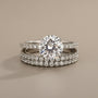 Design Inspiration: At the heart of this magnificent set lies a stunning 2.0-carat round cut moissanite diamond. This center stone captures the light beautifully, radiating an unparalleled brilliance that rivals traditional diamonds. Surrounding the center stone and adorning the band are additional round cut moissanite diamonds, with a total band stone weight of 0.6 carats. These white stones are meticulously set to create a harmonious and continuous circle of sparkle, symbolizing eternal love and commitment.