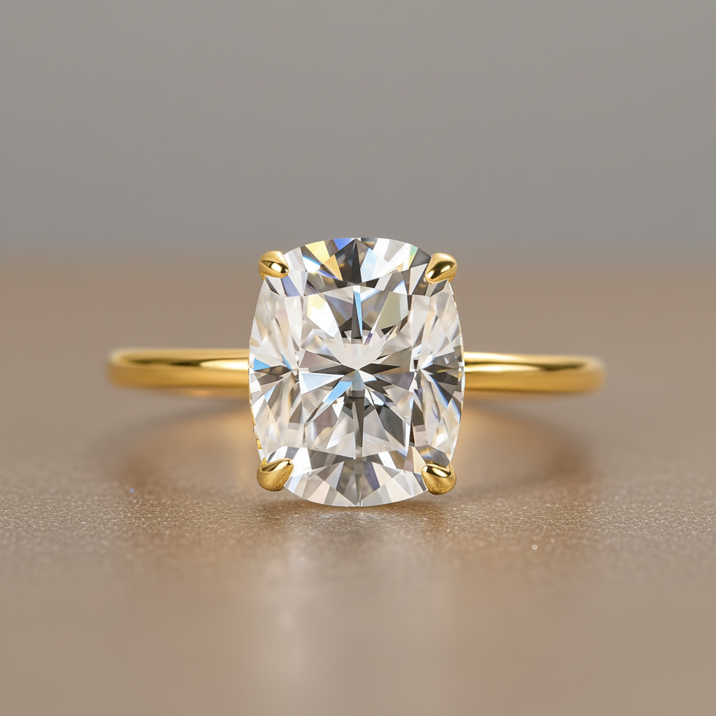 Design Inspiration: The ring is a luxurious and elegant choice for those seeking a timeless design with a touch of warmth. This ring features a stunning cushion-cut moissanite stone held in a classic 4-prong setting, crafted in lustrous yellow gold.