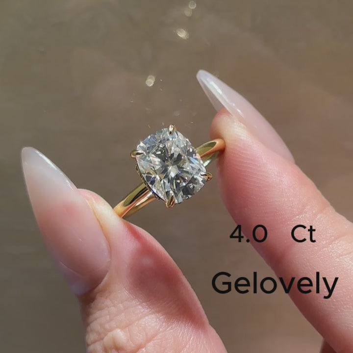 Gelovely Moissanite 2.5Ct~4.0 Ct Cushion Cut Yellow Gold Engagement Ring