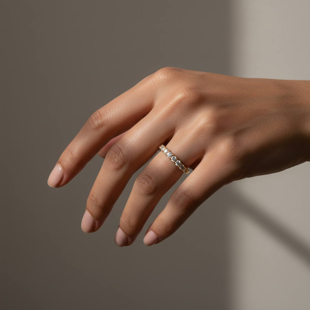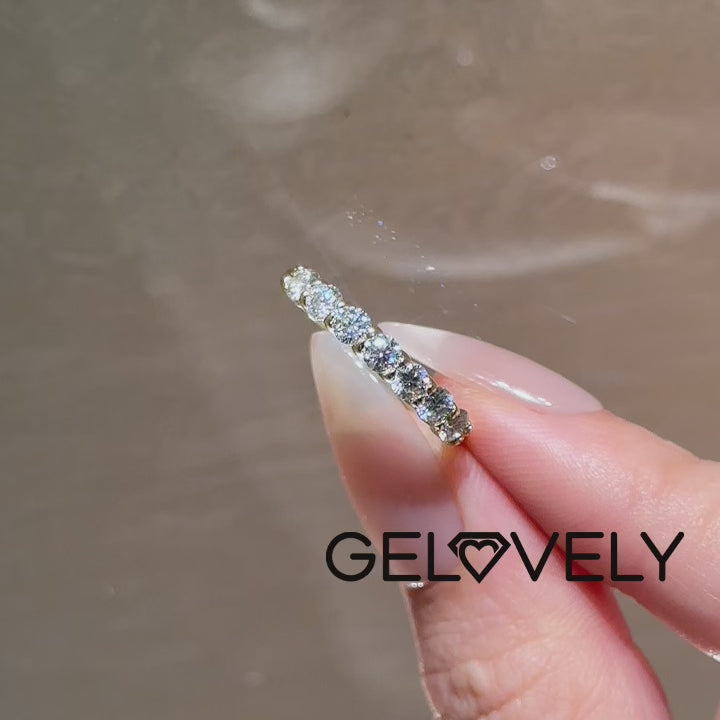 Design Inspiration: The true allure of this wedding band lies in its sparkling gemstones. Adorned with 0.7 carats of meticulously selected round-cut moissanite diamonds, this band captures the light with every movement, reflecting a dazzling array of colors. Each white stone is carefully set to create a continuous half-eternity pattern, symbolizing everlasting love and commitment.