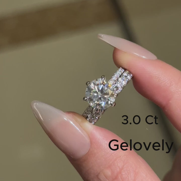 Design Inspiration: Inspired by the harmonious blend of timeless elegance and contemporary allure, this Gelovely wedding ring set reimagines classic romance through a modern lens. The design celebrates the brilliance of moissanite—a gemstone revered for its ethical origins and dazzling fire—crafted into a flawless 3.0-carat round cut center stone. Its round shape, a symbol of infinite love and unity, is elevated by a delicate claw setting that allows maximum light to dance across the stone’s Excellent-cut facets, amplifying its D-color purity and VVS1 clarity.