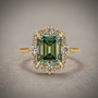 The emerald cut stone, with its unique shape and brilliance, serves as the focal point, exuding sophistication and glamour. The overall look is polished and modern, making it suitable for both everyday wear and special occasions. This ring captures the essence of timeless romance while embracing current design trends.